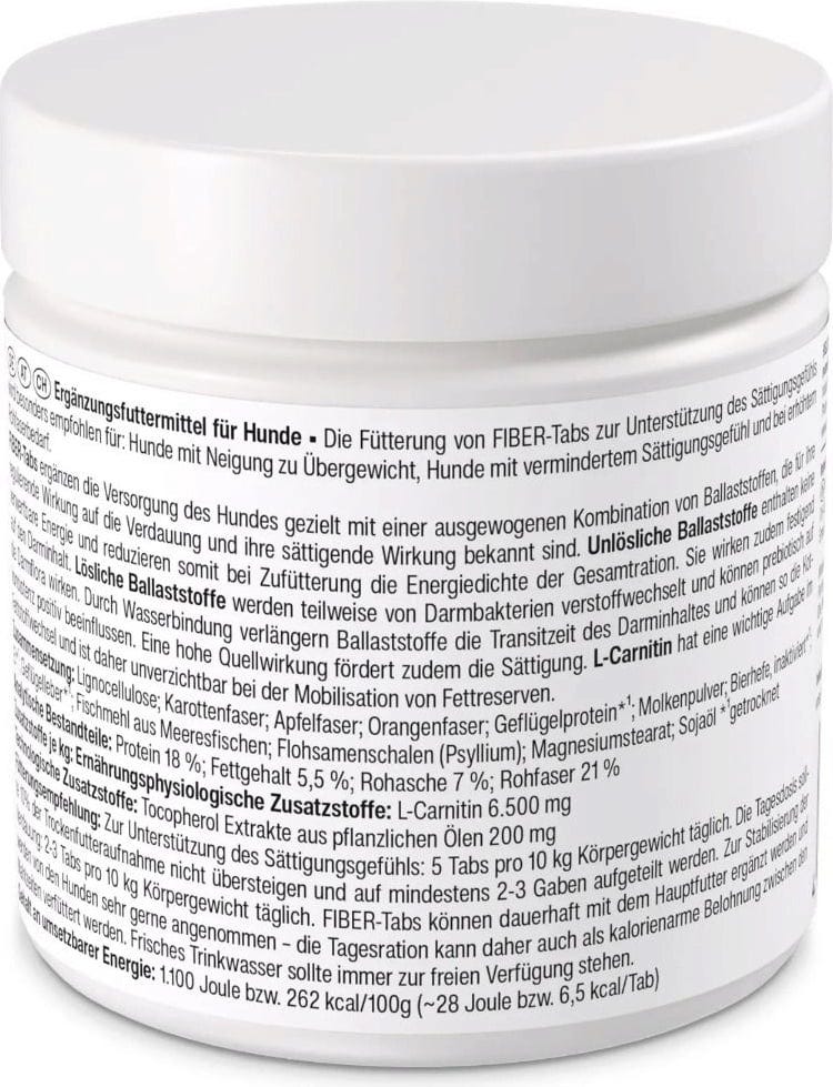 Diese ballaststoffreichen Fiber Tabs besitzen eine sättigende Wirkung und können die normale Verdauungsfunktion unterstützen. Sie eignen sich optimal für Hunde mit vermindertem Sättigungsgefühl, Neigung zu Übergewicht sowie bei erhöhtem Rohfaserbedarf.