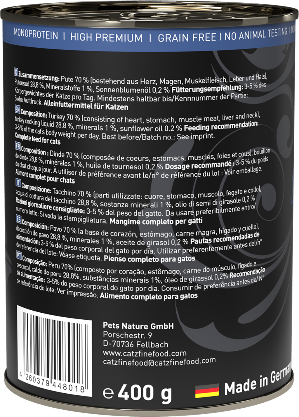 - Hochverdauliches Monoprotein- auch für ernährungssensible Katzen geeignet