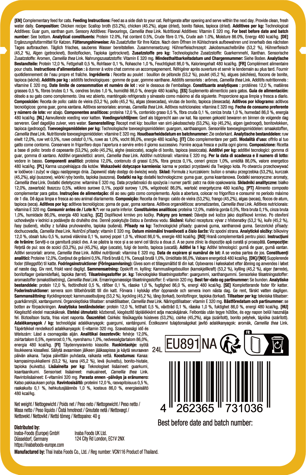 53,4 % Jakobsmuschel-Brühe, 45 % Hühnerfleisch, Bonitoflocken, Tapioka getrocknet, Agar, Guarkernmehl, Xanthan