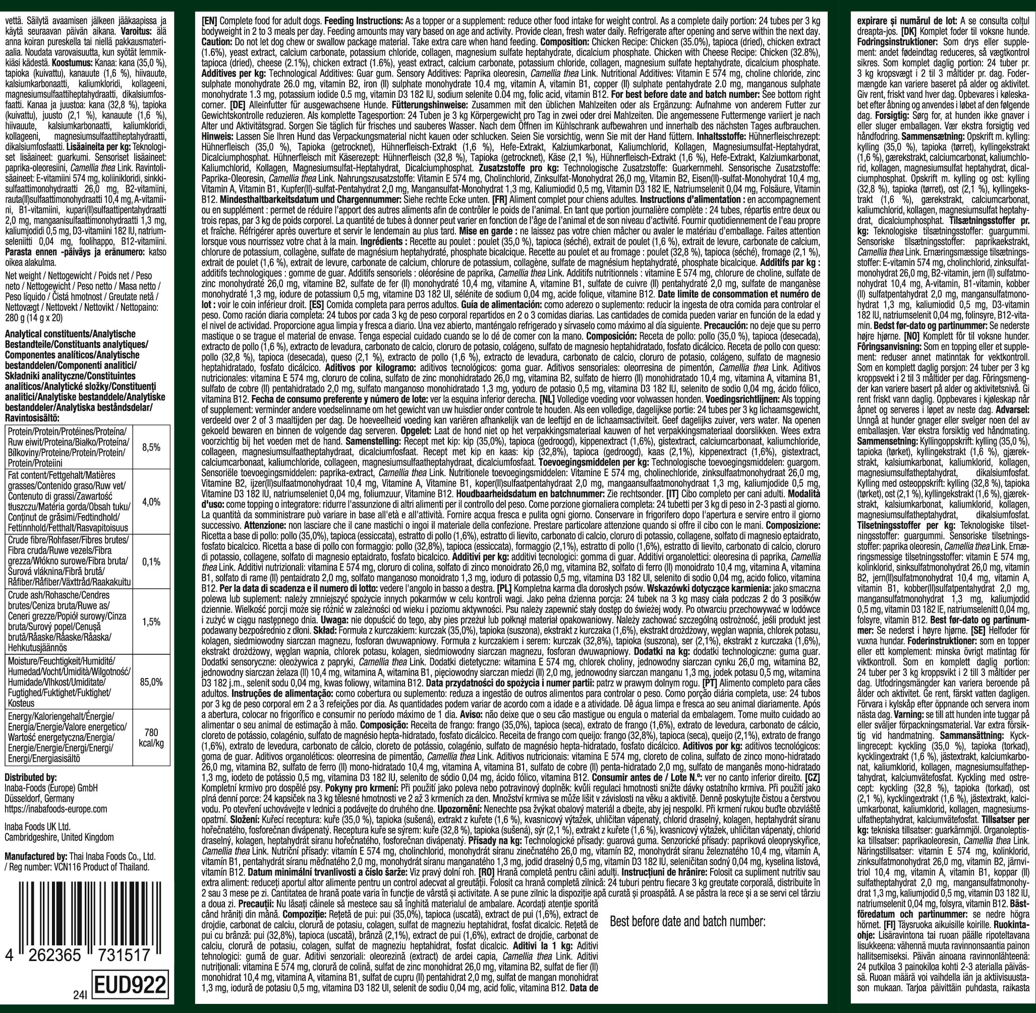 35 % Hühnerfleisch, Tapioka getrocknet, 1,6 % Hühnerfleisch[1], Hefeextrakt, Kalziumkarbonat, Kaliumchlorid, Kollagen, Magnesiumsulfat-Heptahydrat, Dicalciumphosphat
