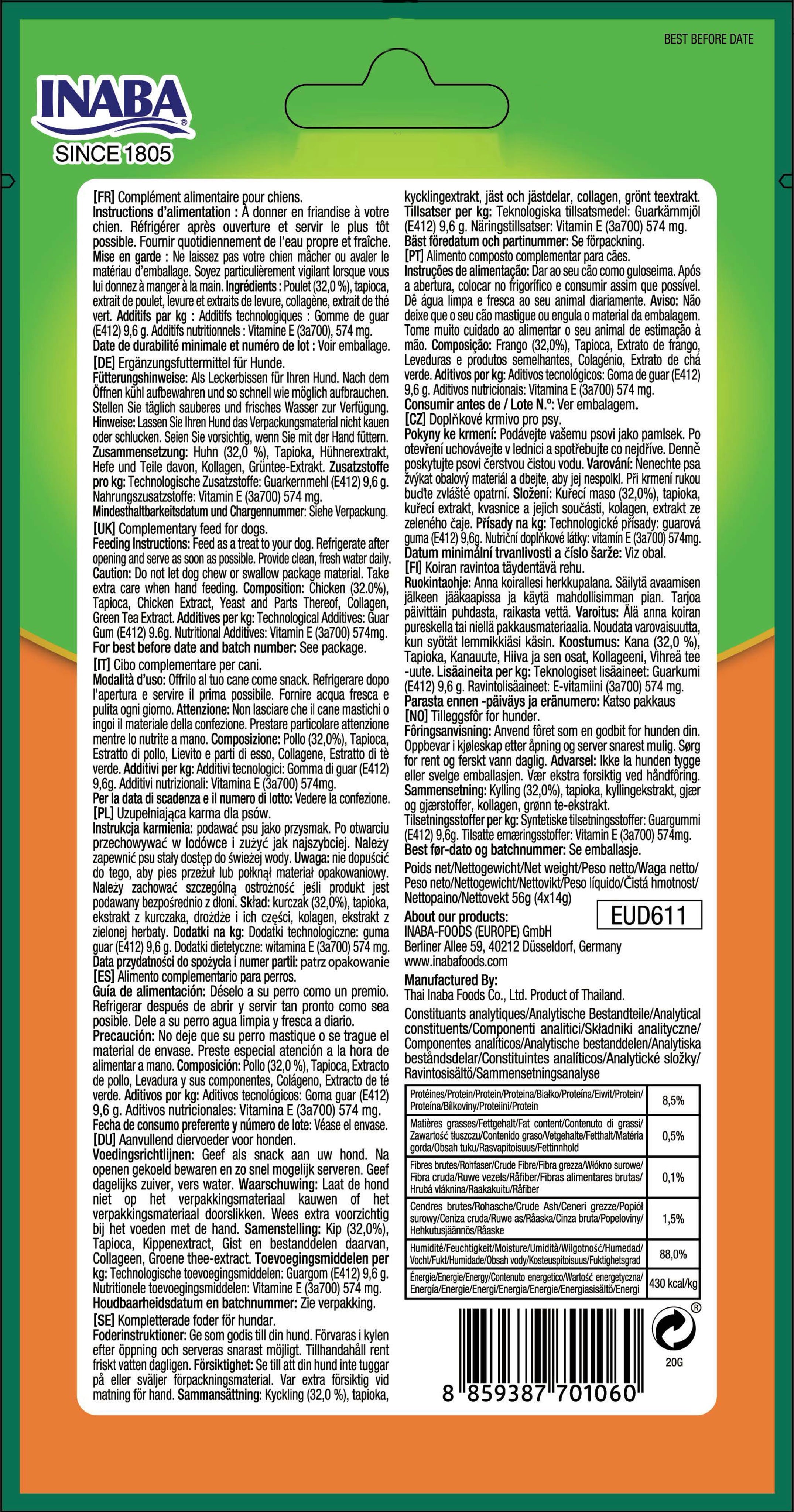 32 % Huhn, Tapioka, Hühnerfleisch-Extrakt, Hefe, Kollagen, Grüntee Extrakt, Guarkernmehl