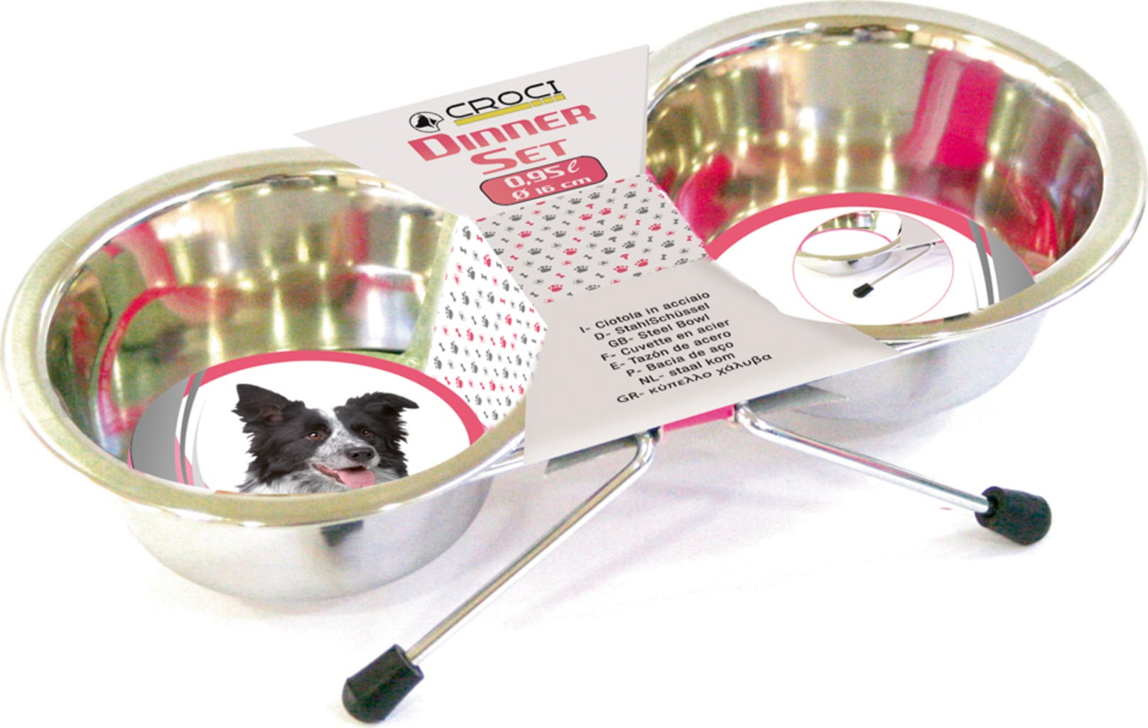 Dieses Dos Set von Croci ist mit zwei Stahlschüsseln und einem dazu passenden Ständer ausgestattet. Der Ständer aus Stahl verfügt über rutschfeste Gummifüße, die während der Mahlzeiten fest am Boden bleiben, ohne sich zu bewegen.