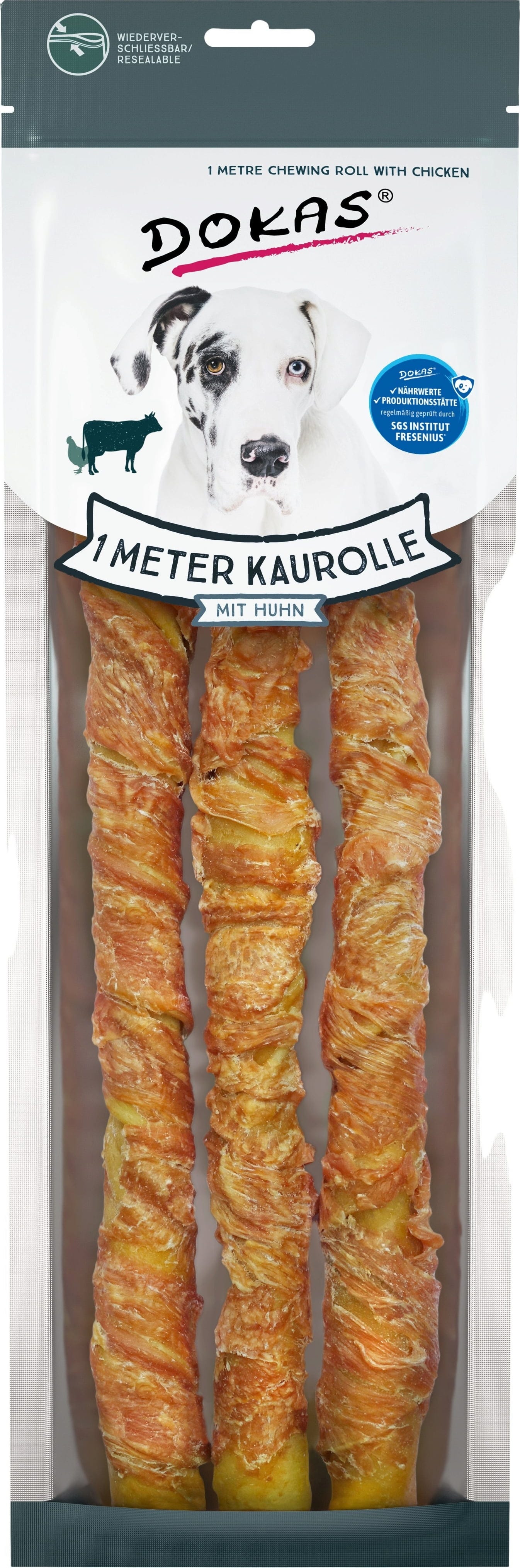 Die 1 Meter Kaurolle von Dokas bietet besonders langen Knabberspaß. Herzhafte Rinderhaut, überzogen mit feinem Hühnerbrustfilet, kann auch geschmacklich überzeugen und stellt eine ideale Belohnung für deinen Vierbeiner dar.