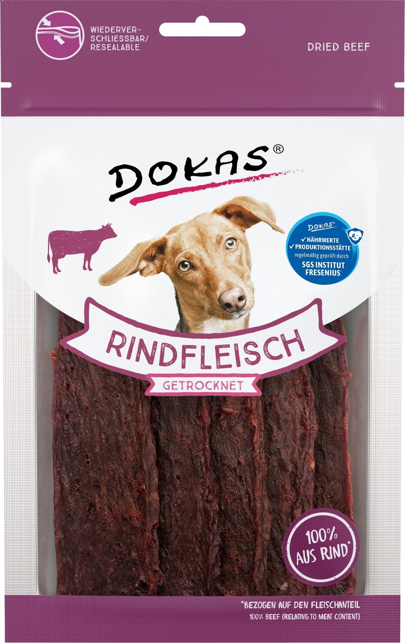 Den aromatischen und luftgetrockneten Fleischstreifen von Dokas kann kein Hund widerstehen! Sie bestehen aus 100 % hochwertigem Rindfleisch* und stellen einen wunderbaren Snack für zwischendurch dar. Ein ganz besonderer Genuss, der garantiert für treu ergebene Hundeblicke sorgt.