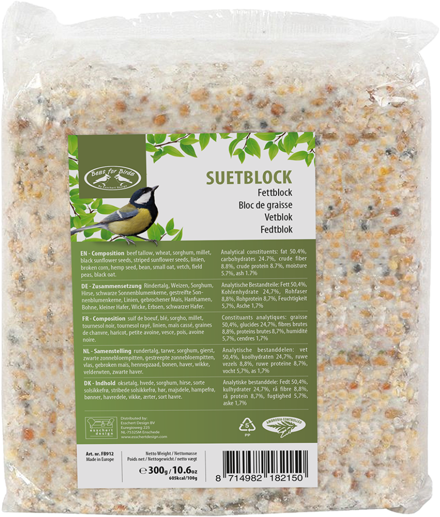 Er ist besonders nahrhaft und liefert den Tierchen vor allem in Winter eine reichhaltige Mahlzeit. Umfasst von Rindertalg enthält der Block Weizen, Hirse, Sonnenblumenkerne, Mais, Bohnen, Hafer und vieles mehr.