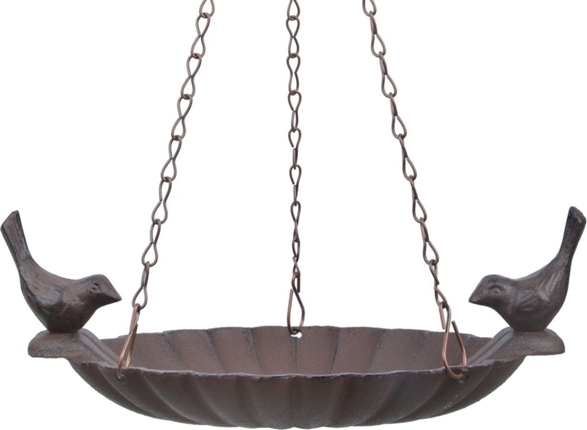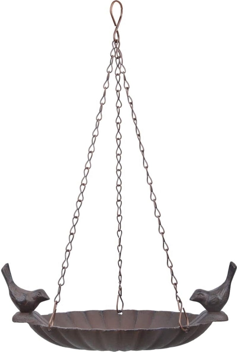 Die wunderschöne Vogeltränke aus stabilem Gusseisen bietet durstigen Vögeln einen gemütlichen Rastplatz. Mit der Kette und dem Aufhängehaken kann sie ohne großen Aufwand an einem Baum, einem Balken oder der Decke montiert werden. Der Platz sollte jedoch ruhig und unzugänglich für Katzen gewählt werden. Vögel nutzen eine mit Wasser gefüllte Tränke übrigens nicht nur zum Trinken, sondern auch für ein entspanntes Bad.