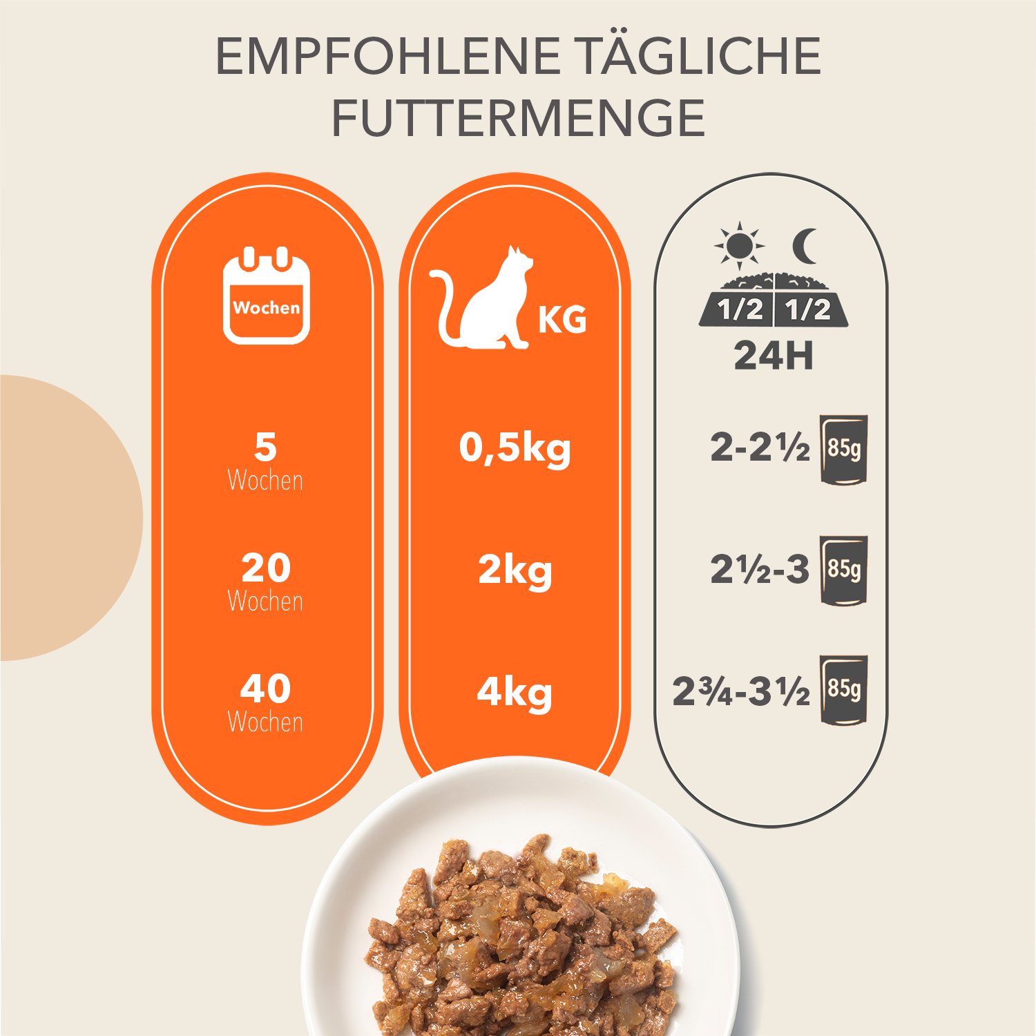 - Die tatsächliche Fütterungsmenge kann je nach Alter, Aktivität und Rasse deiner Katze variieren.