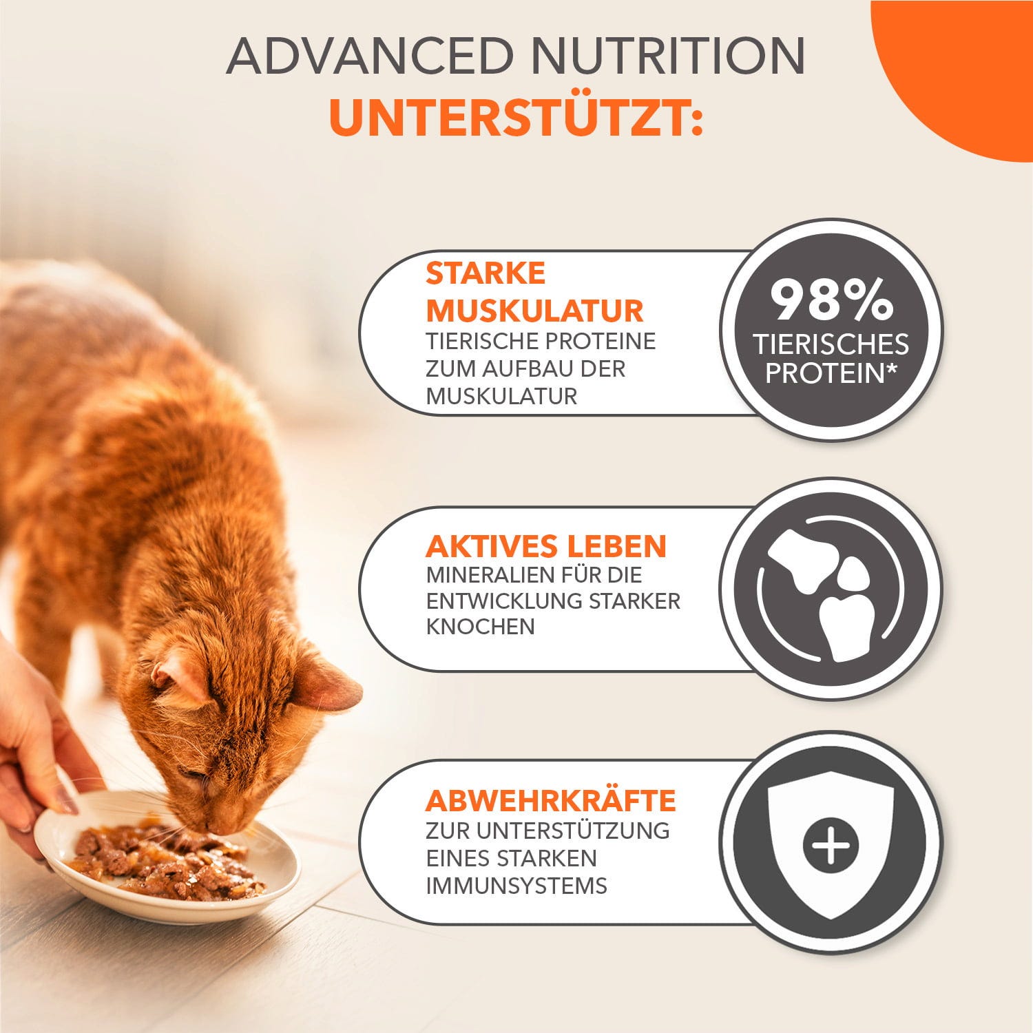 Dank des besonders hohen Anteils an tierischem Protein wird der natürliche Fleischfresser in deinem Kätzchen bestens versorgt. Die leicht verdaulichen Zutaten sorgen dafür, dass die Energie genau dort ankommt, wo sie gebraucht wird: beim Spielen, Toben und Wachsen. Mit jedem Beutel gibst du deinem Liebling eine 100 % vollwertige Mahlzeit, die keine Wünsche offen lässt.