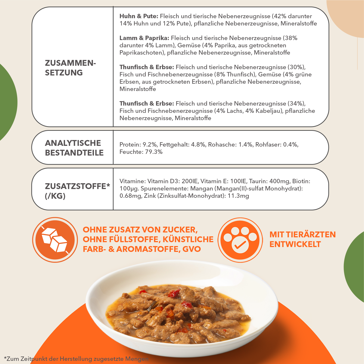 - Mit vier köstlichen Sorten: Huhn & Pute, Lamm & rote Paprika, Wilder Thunfisch & Erbsen, Gedünsteter Lachs & Kabeljau