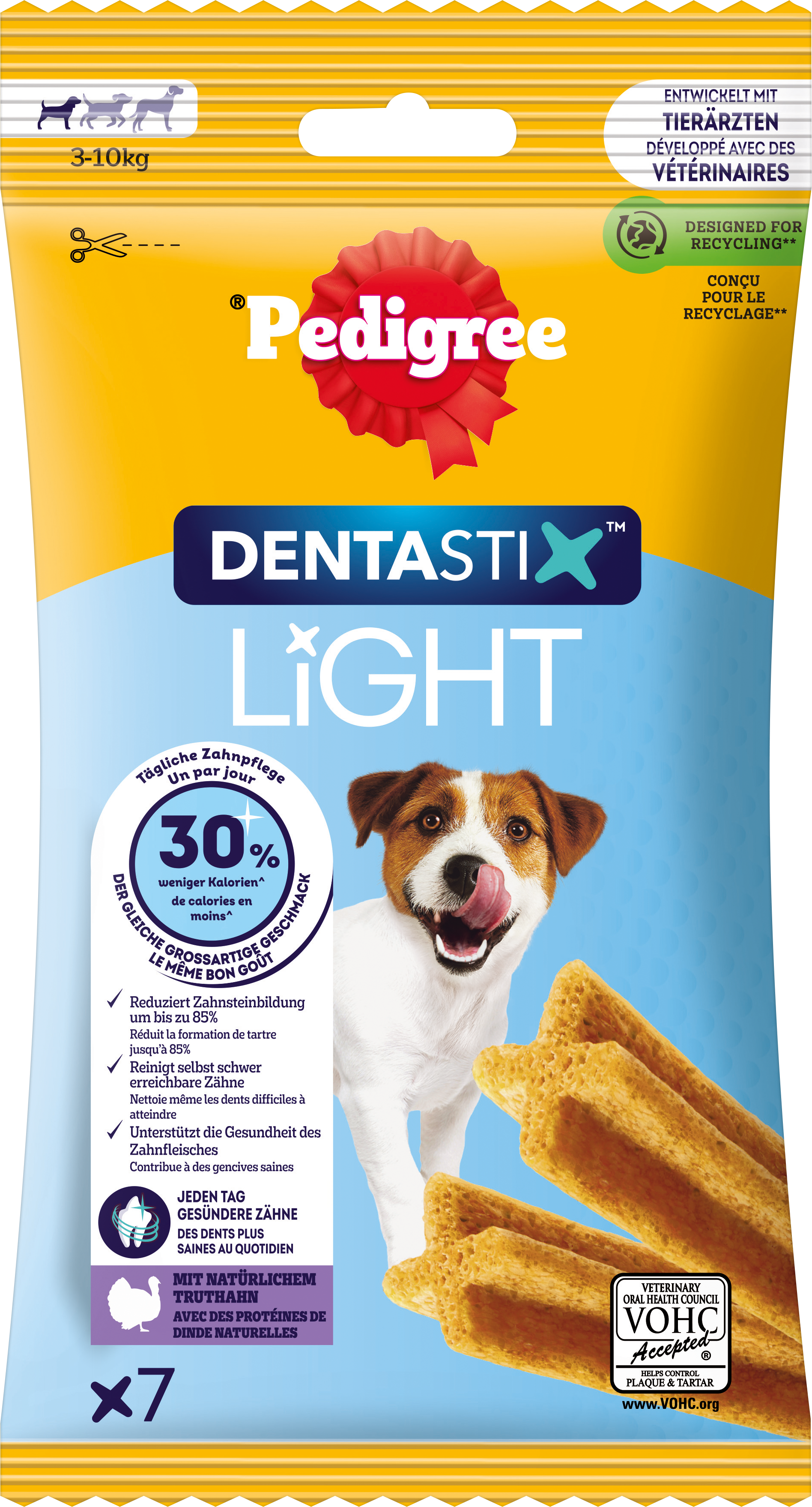 PEDIGREE® DENTASTIX™ LIGHT Small unterstützen die Zahnreinigung deines Hundes und können Plaque und Zahnstein reduzieren. Mit 30 % weniger Kalorien pro Stick sind sie ideal für die tägliche Zahnpflege. Der leckere Truthahngeschmack sorgt dafür, dass dein Hund den Snack liebt.