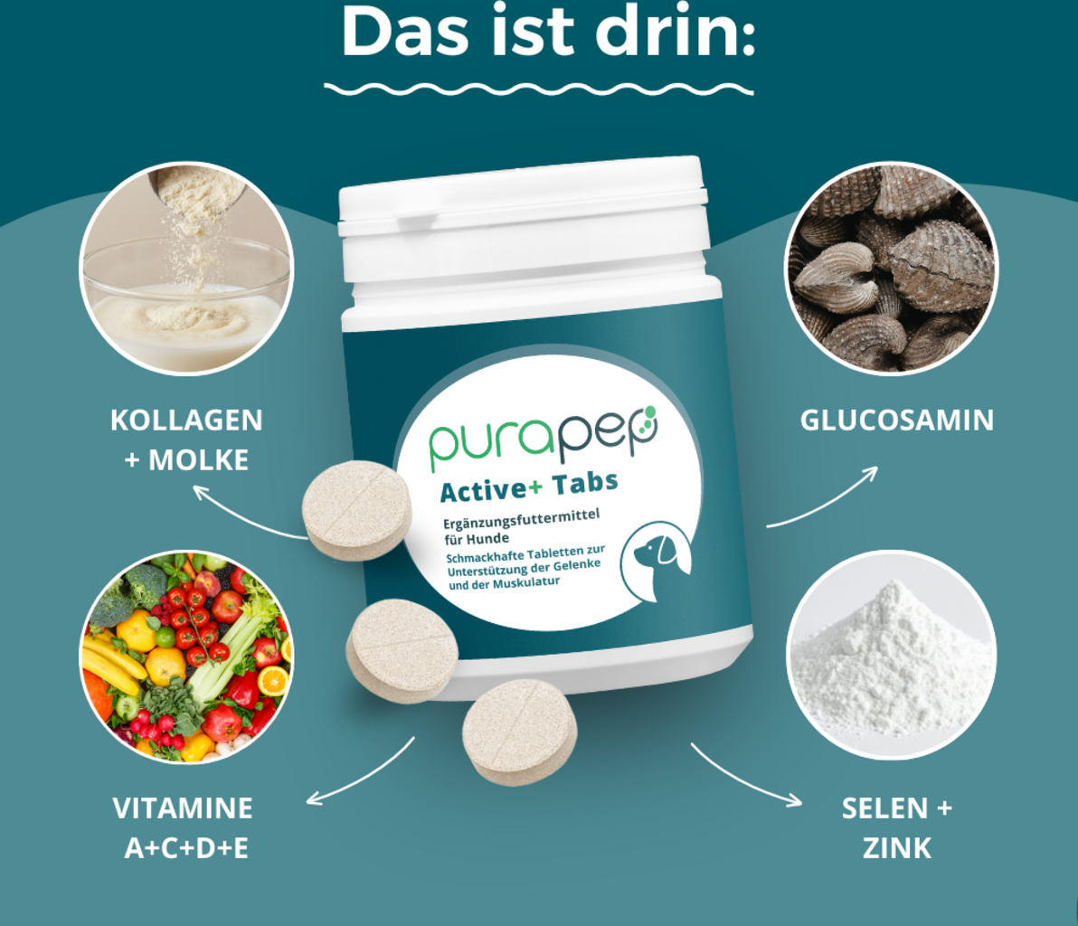 Die purapep Active+ Tabs sind eine schmackhafte Ergänzung für Hunde jeden Alters, die gerne aktiv sind. Die Tabletten zum Kauen wurden entwickelt, um die Gelenke und Muskulatur der pelzigen Freunde zu unterstützen und ihnen ein Leben voller Bewegungsfreiheit zu ermöglichen.