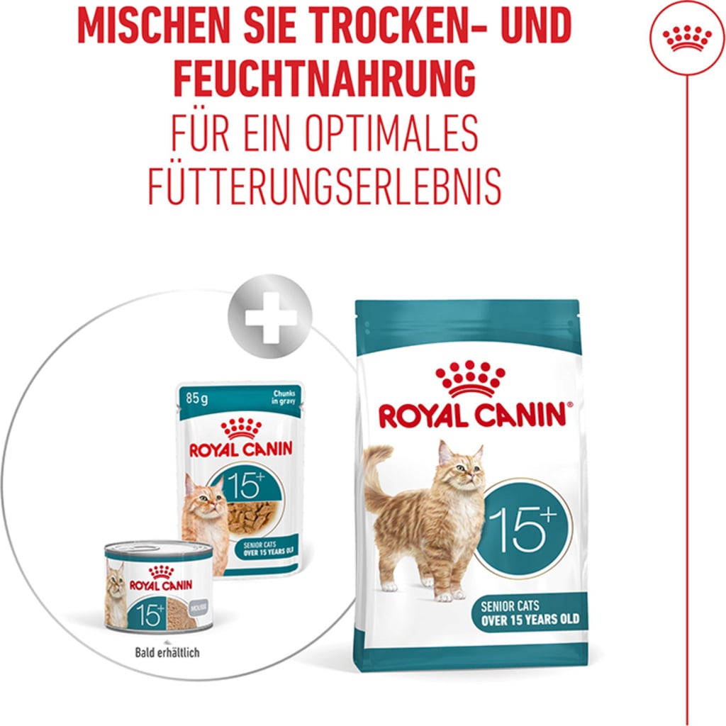 ROYAL CANIN® AGEING 15+ ist in verschiedenen Texturen erhältlich, darunter besonders weiche Mousse und als Trockennahrung