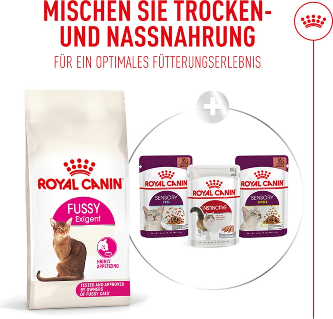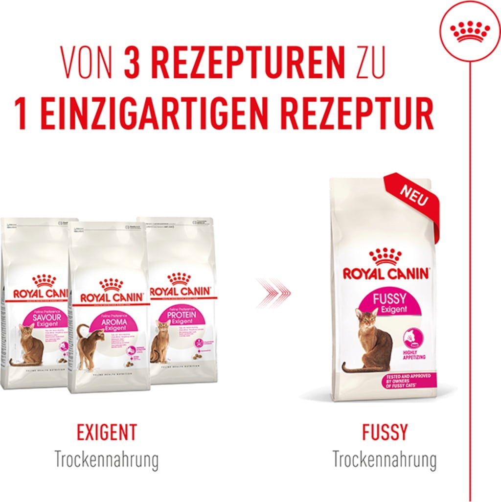 Um wählerischen Katzen eine Ernährung mit maximalem Geschmack zu bieten, kombiniert die Fussy-Rezeptur unsere 3 früheren Exigent-Rezepturen – Savour, Aroma und Protein – in einem Produkt: ROYAL CANIN® Fussy.
