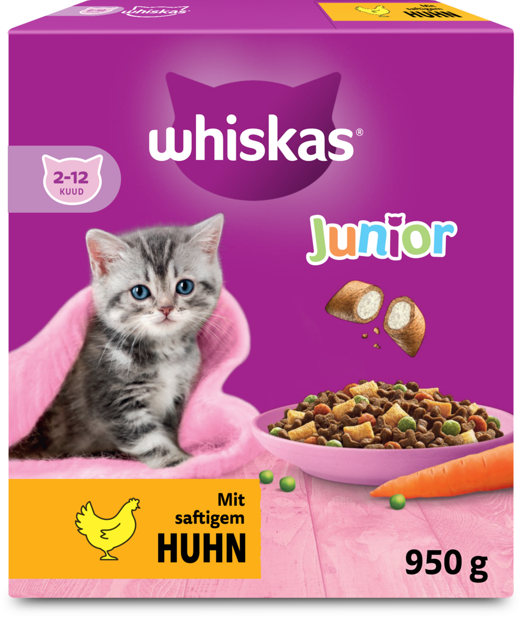 Diese schmackhafte Trockennahrung von Whiskas eignet sich für junge Katzen im Alter von 2 bis 12 Monaten. Die leckeren Knackits haben eine knackig-knusprige Hülle und eine weiche Füllung mit Geschmack nach Huhn: Diese köstliche Kombination wird die kleinen Genießer besonders umhauen. Das ausgewogene Futter enthält Vitamine und Mineralien im optimalen Verhältnis, damit das Kätzchen sich energisch und gesund entwickeln kann! Der kontrollierte Mineraliengehalt wirkt sich positiv auf die Gesundheit der Harnwege aus.